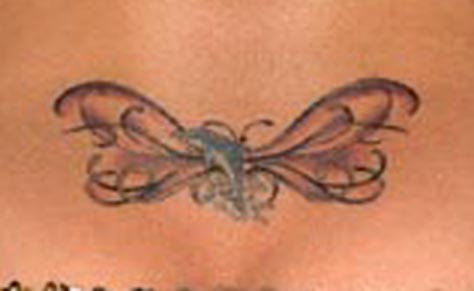 of a dolphin / butterfly on her lower back, a butterfly tattoo on