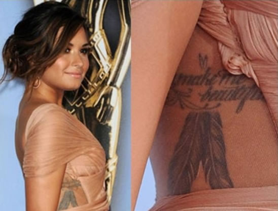 | Demetria Devonne "Demi" Lovato (born August 20, 1992) is an American singer-songwriter, musician and actress. She made her debut as child actress in Barney & Friends. In 2008, she came to prominence as a starring cast member in the television film Camp Rock. She signed to Hollywood Records the same year, and released her debut studio album Don't Forget in September. It has been certified Gold by the Recording Industry Association of America (RIAA). In 2009, Lovato was commissioned her own television series Sonny with a Chance. That year, her second album Here We Go Again became her first to debut to top the U.S. Billboard 200. After the release of additional television films and their accompanying soundtracks in 2010, Lovato's personal struggles the following year sent her acting career into hiatus. Her third album Unbroken (2011) addresses several of her difficulties, notably her lead single "Skyscraper". Since 2012, Lovato has served as a judge and mentor on the American version of The X Factor. Her fourth album Demi (2013) was preceded by its lead single "Heart Attack". Throughout her music career, Lovato has embarked on several concert tours. In 2008, she served as the opening act for the Jonas Brothers' Burnin' Up Tour and Avril Lavigne's Best Damn Tour. Later that year, she embarked her first headlining tour, the Demi Live! Warm Up Tour, and has held four additional promotional tours in the ensuing years. Her work has additionally earned several accolades, including one MTV Video Music Award and several Teen Choice Awards nominations. Outside of her work in the entertainment industry, Lovato is involved in philanthropic activities through charity work and various social and environmental causes. Demi Lovato has around thirteen tattoos. Her tattoos include: "You make me beautiful" on her side; A feather behind her ear; "Stay Strong" with a heart on her wrists; Lips on her wrist; A cross on her hand; Feathers on her side; "Peace" on her finger; "Rock N Roll" on her finger; "Faith" on her arm; "Let Go & Let God" on her feet; a flock of birds on her arm; "Now I’m A Warrior" on her shoulder blade. Want to find out what some of Demi Lovato's tattoo designs & symbols mean? Check out: Feather tattoos, Letters, Hearts, Lip tattoos, Memorial tattoos, Bird Tattoos, Cross tattoos |