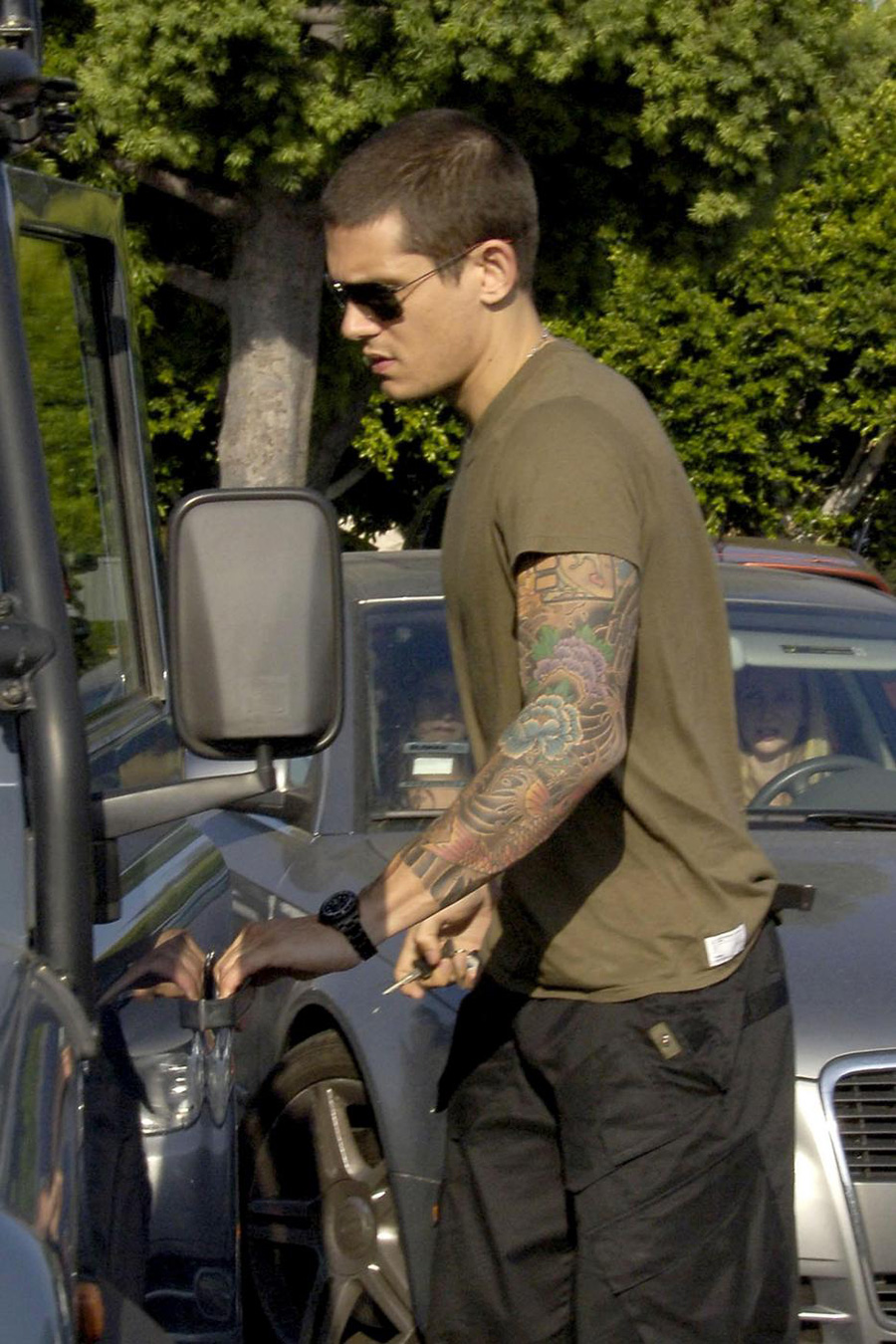 John Mayers tattoos include: full sleeve elaborate design; a Japanese-inspired tattoo (left bicep); unknown/possible Japanese artwork (left inner upper arm, apparently done while in Dallas during the Continuum tour-June 2007); Home Life, it's half of the "message" in each arm, representing how he feels about being on the road (left and right triceps, in the back); and 77 his birth year (left side of chest).