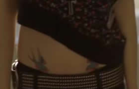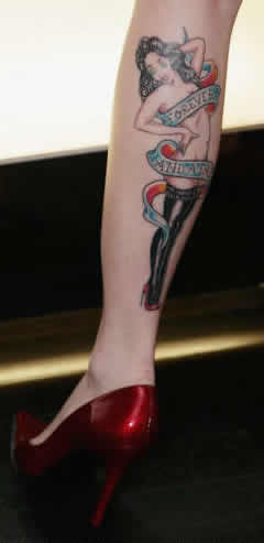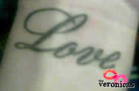 This Beauty has a number of tattoos One on her wrist that says "Love", "Where words fail... music speaks" on back of her left shoulder, large pinup girl on back of left calf, initials JCL for herself, her sister & mother on her other wrist, two birds on her hips, a heart and the words "my blood is red for you" on her left bicep, which has since been modified. The words have been blacked out, there was an addition of a bottle of "poison", a rocker girl in leather pants holding a guitar and the word "pure" were also added to the sleeve.