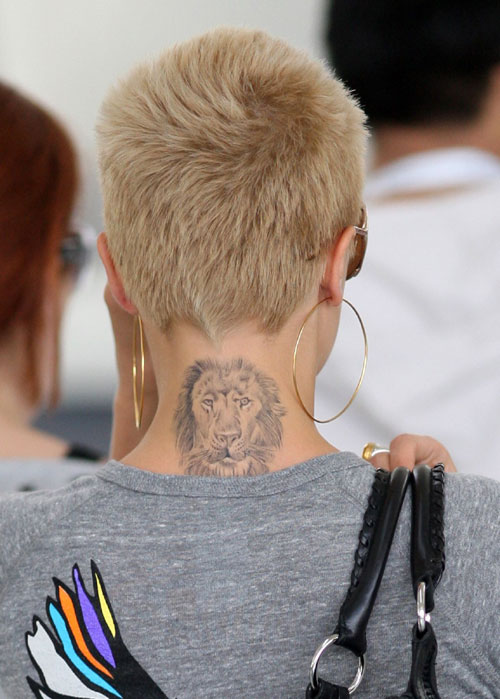 Suvari has a large script tattoo on her back, which reads 'Word, Sound, Power', as well as the head of a lion on her neck, a word just above the lion and a smaller tattoo on her chest.