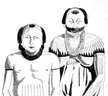 For the Mundurucú, however, the efficacy of feathers was most clearly brought out in relation to their role in consecrating the human trophy head captured in war. Feathers were considered to be the "crowning glory of a trophy head" and without them, the skull would not release its magical powers. THE MUNDURUCÚ HEADHUNT AND TROPHY HEADS Military expeditions were launched in the dry season and usually ended with the coming of the rainy season. Each headhunting warrior was accompanied by his wife or sister who assisted him in carrying the necessary equipment including food, hammock, and weapons. Women also tended to the wounded and according to some reports were distinguished by their ability to "cleverly catch the arrows of the enemy in flight." Attacks were waged at dawn and flaming arrows were sent aloft to set fire to the enemy's huts. The incendiary panic that ensued, combined with the visage of waves of fully tattooed warriors brandishing their headhunting gear, no doubt played a major role in the psychological dimension of Mundurucú warfare. At feasts, the Mundurucú used scepters, hats, caps, and several varieties of garlands made of feathers, as well as feather mantles which they drew over their shoulders, and aprons of emu feathers which they tied around their waist. Feathers, as outcroppings of the body and especially the head, where thought to possess divine potency. Enemy warriors who fell on the field of battle were decapitated if time permitted. Occasionally, the head of an enemy woman was taken, but usually they were taken prisoner instead. Children captured in war were adopted and fully incorporated into Mundurucú society. A clan name was bestowed upon the child and he or she received the elaborate facial and body tattooing that distinguished the Mundurucú from other tribes living in central Brazil. Trophy heads seized by Mundurucú warriors were not shrunken like those of the Jívaro of Ecuador, rather they were desiccated, dressed (brain removed), and colored with genipap or urucú (red) vegetable dye. The wife or sister of the successful warrior sometimes assisted in the preliminary preparation of the heads, but not always. Karsten describes the specifics of Mundurucú trophy preparation as follows: