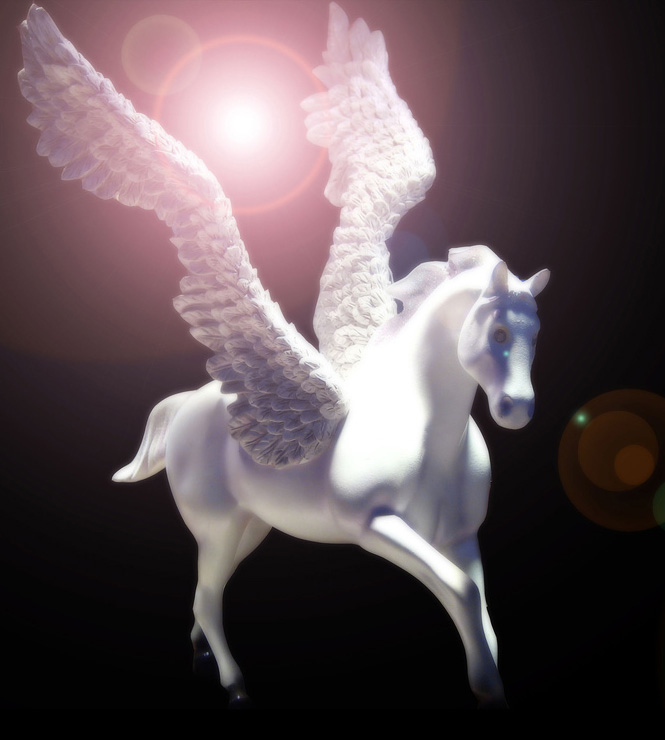 It was Pegasus who carried Perseus to rescue Princess Andromeda when she was chained to the dragon-guarded rock. Hero and Princess married, and together with Pegasus they became a constellation of stars twinkling in the heavens. As it says in the 5th century B.C. Greek lyric -- "Pegasus dwells in the ancient stalls of Zeus upon Olympus."