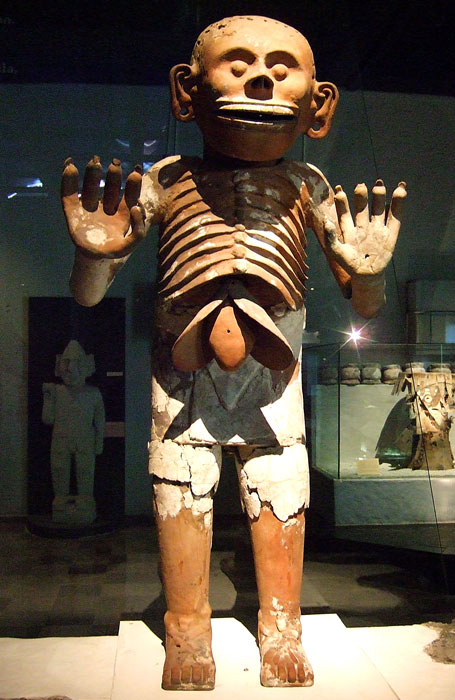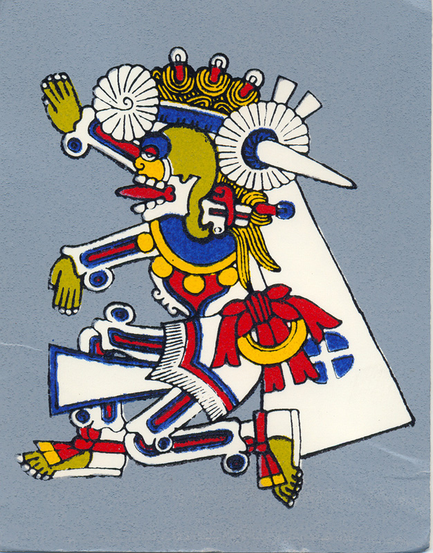 According to Aztec legend, the twin gods Quetzalcoatl and Xolotl were sent by the other gods to steal the bones of the previous generation of gods from Mictlantecuhtli. The god of the underworld sought to block Quetzalcoatl's escape with the bone and, although he failed, he forced Quetzalcoatl to drop the bones, which were scattered and broken by the fall. The shattered bones were collected by Quetzalcoatl and carried back to the land of the living, where the gods transformed them into the various races of mortals.