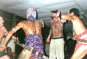 It was clear that David and his sons were beginning to get excited by the prospect of a family reunion. As we neared the shore, people poured out of the longhouse and spilled onto the beach. As our long boat crunched onto the gravel of the rivers edge, dozens of outstretched hands offered to help us ashore. A crowd of people surged up the hill to the long house. At the top waited Aki basai, the "big grandfather". He and David embraced and there were greetings all around in a torrent of Iban. Thomas and I shook many hands and those who could not get our hands, reached out to touch our arms and pat us on the back. When they saw our tattoos their smiles grew even wider, if that was possible. Aki basai took both of our hands in his and greeted us with a big smile and a little head bow. Aki basai is a striking figure. With three wives at the age of 86, he wears a perpetual smile, made all the more remarkable because all of his teeth are gold and his lips are stained a deep crimson from the juice of the beetle nut he constantly chews. To complete the image of the smiling Buddha is his bald pate, rounded belly and eye-brows permanently tattooed in an impish arc. Aki basai had just recently resigned as Headman of the Longhouse and passed on his responsibilities to a son-in-law. He loved everyone's tattoos and asked David when he was finally going to get one himself! David mentioned that it was too bad we hadn't arrived just the day before because apparently there had been a large cock-fighting tournament which everyone was still talking about. That was all the encouragement Thomas and I needed. That and the rice wine and warm beer we were soon drinking. Thomas and I got David to haggle vigorously on our behalf. Thomas and I wanted Champion Roosters. No pretenders to the throne. The volume of the conversation grew to a roar. There was much shouting and laughing about who had the best fighting cocks. Finally we settled on a price of fifty ringhat apiece for two roosters. The crowd roared with laughter when Thomas and I were presented with our birds and we each held them aloft. It was clear the crowd was divided over who the winner would be. Thomas and I had made it clear that we did not want our cocks fitted with spurs, and in fact the roosters natural spurs had been trimmed to nubs. But these two birds were issuing challenges to each other at the tops of their lungs. The Iban had picked out a rooster for me that was red, as red in fact as my beard. Tom's was a pale, mottled yellow. We christened them "Big Red" and "Little Yeller". A huge circle formed and Tom and I released our roosters, the Ibans roaring with laughter as Tom and I danced around like a couple of fight managers at a Championship Bout. Because the roosters were basically unarmed without fighting spurs attached, our cockfight wasn't much more than a glorified sparring match. The birds were impressive athletes. The jumped and danced, spun around each other and lunged at each other with beaks and feet. They even somersaulted over each other in the air like they'd been watching too many Bruce Lee movies. Within two minutes they were panting heavily. Each had lost one or two feathers. Thomas and I called it a draw (although frankly, Big Red definitely won the bout on points) and scooped up our roosters before they could get hurt. Traditionally, the Iban eat the losing rooster but Tom and I wouldn't hear of it. I announced to the crowd that Big Red was retired from the fight game and presented him as a gift to Aki basai. Aki basai is a big cock-fighting aficionado and was very pleased with Big Red. I paid for Big Red to be put out to stud and picked out what I thought were a couple of pretty cute hens... Tom presented "Little Yeller" to the Iban man who had haggled on our behalf. Everyone thought the entire proceedings were a great success. I intend to follow the careers of Big red's sons with great interest. With the sun nearly down everyone filed inside the long house. The day isn't over yet... Later Monday, November 13th All the Iban men gathered closely around Thomas. Most of them reached out to touch his tattoos to see if they were real. Around the outer circle gathered the women and children. Once again two or three children shied away from me, but they didn't know what to make of Thomas. They asked if Tom was a "black man" because he has so many tattoos covering his body. Once again it was generally the much older men who had the tattoos. When I asked how they had acquired them, they spoke of their adventures and travels to Miri and Brunei. Akai basai got his first tattoo when he traveled on a plane for the first time. And there, tattooed on both shoulders, were representations of crude airplanes, propellers and all. The older men were interested in my tattoos, especially when I told them that Tom was the artist. And again they asked if the Celtic zoomorphic animals were Iban designs. This was an interesting development. Here in this longhouse there was another single older woman who had a beauty tattoo. It had been done by an Iban man, because only men and never women tattooed. I asked the Iban if tattoos had any other purpose than to recount their life's journey's and adventures. Several older men said that in the old days, in the days of their fathers and grandfathers and grandfathers before them, tattoos were charms. Especially from tiger attacks. And they gave two differing reasons for this. Many of the tattoos were circular in design and some said the tiger wouldn't attack a man if he thought he was being watched by the "tattoo eyes". Another said that the tiger would mistake an Iban man covered with tattoos for another tiger and not attack for that reason. Also the tattoos could protect the Iban from evil spirits in the forest who would do you harm. The talk then turned to charms. The Iban believe that charms could make bullets miss them in battle. The British Army had formed a Battalion of Iban Rangers in the Second World 